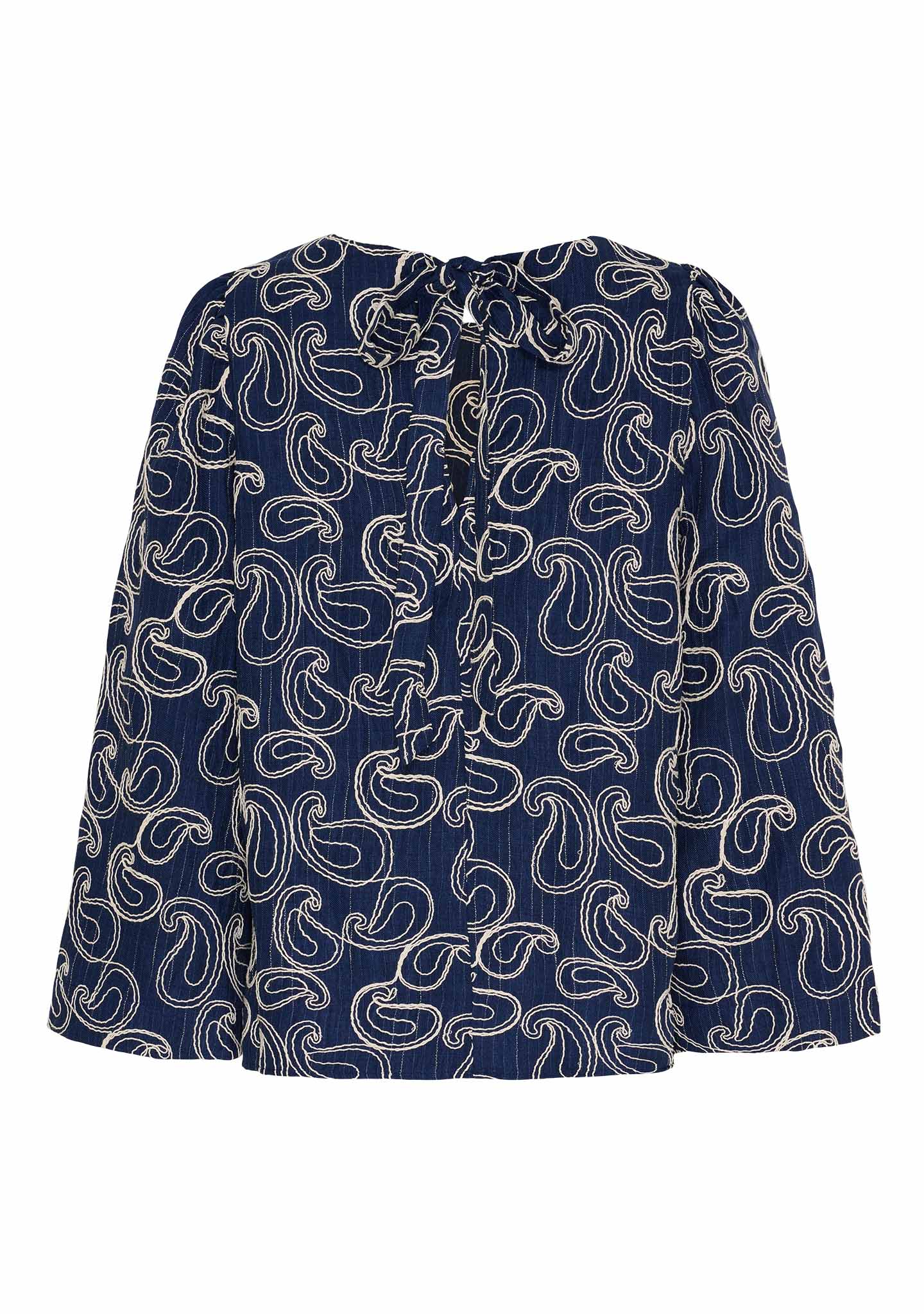 Juna New Blouse är en iögonfallande blus med en lyxig tygstruktur skapad av påsydda band/broderier, vilket ger en elegant och unik look. Den runda halsen kombinerad med en droppformad slits i ryggen och ett nackband ger en feminin touch.