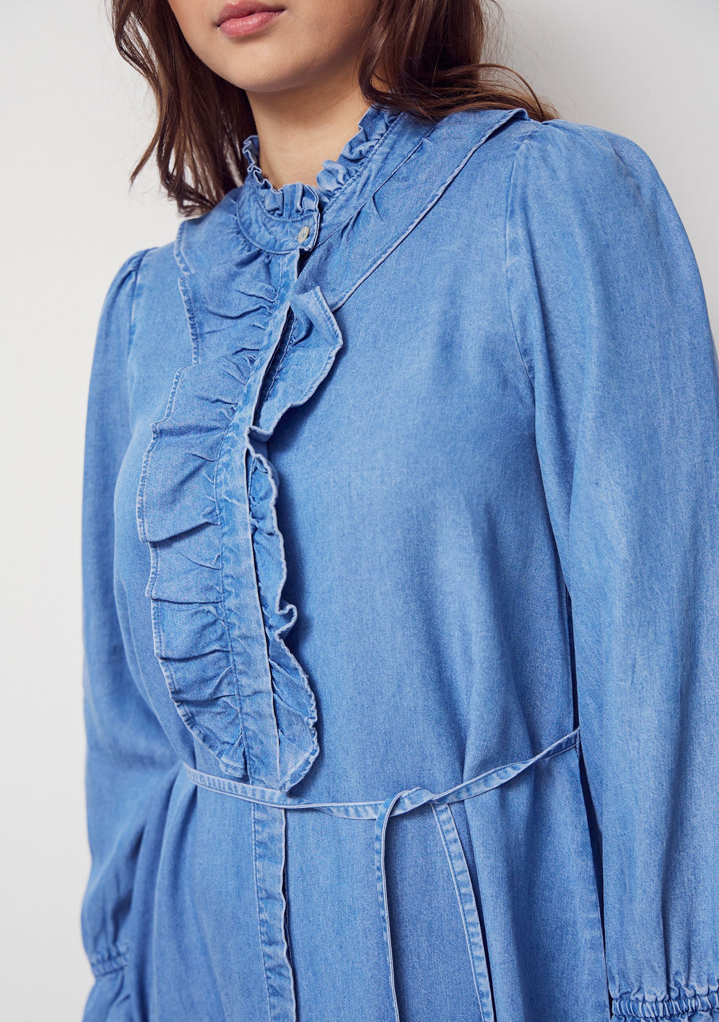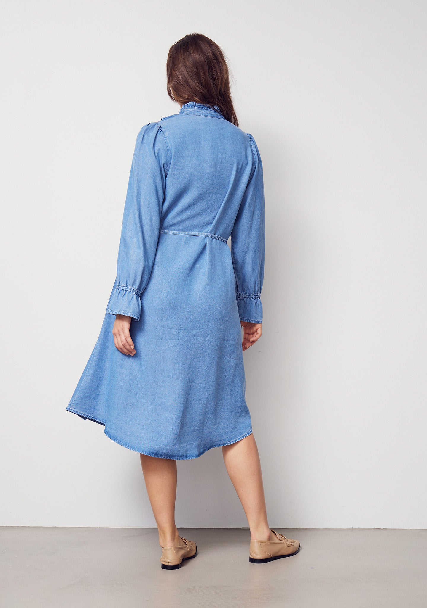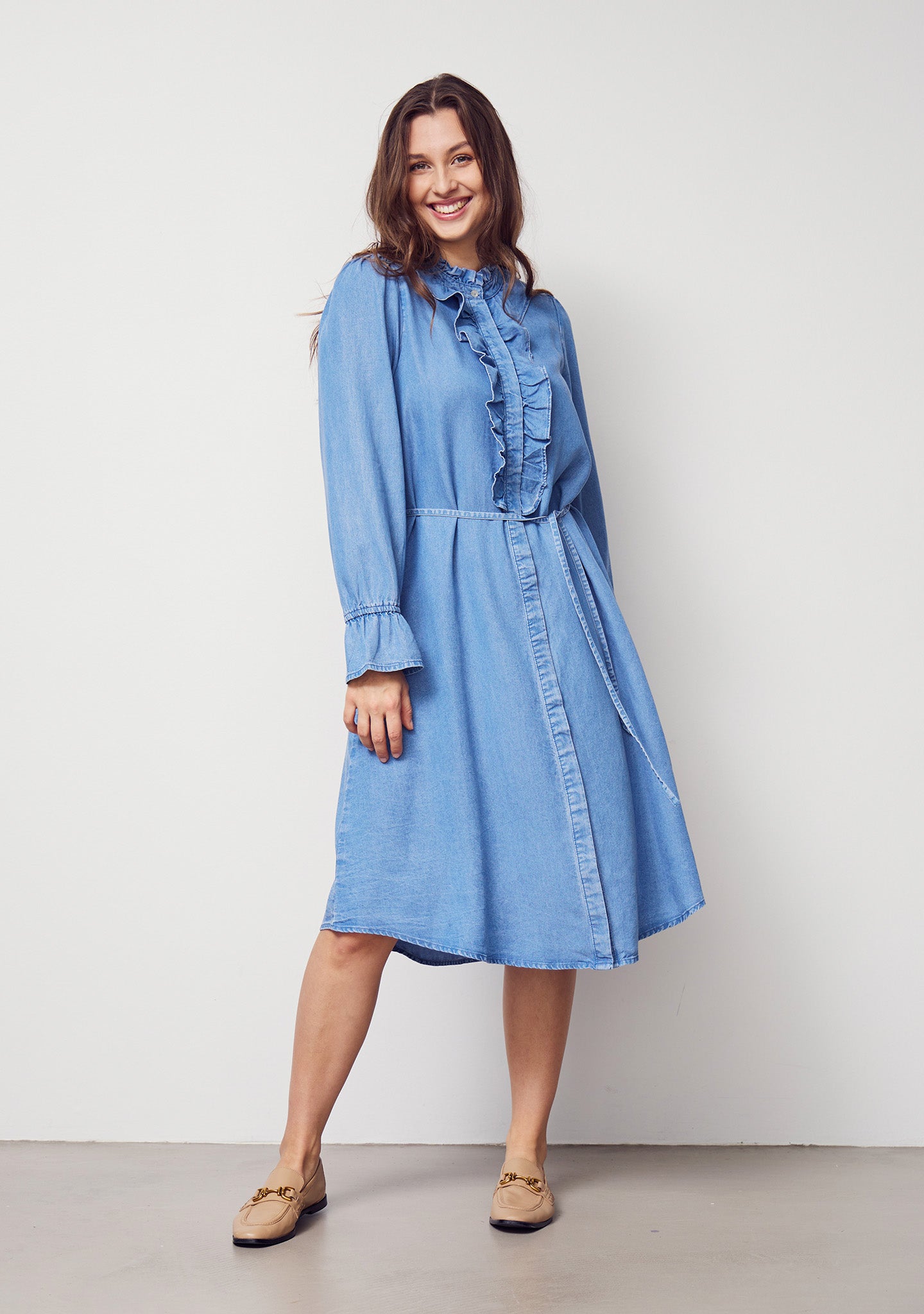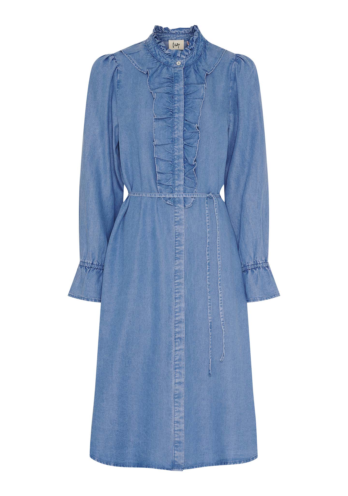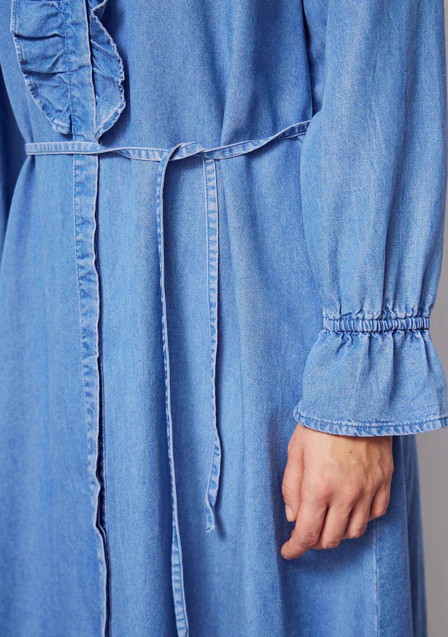 Isay Ganja Flounce klänning med sin charmiga rysskrage och långa ärmar med elastiska ärmslut är denna klänning ett perfekt val som kombinerar stil med komfort. Det medföljande knytbältet ger dig möjlighet att framhäva midjan efter behov, medan den lösa passformen ger en luftig känsla som naturligt följer din kropp. Tillverkad av 100% Tencel, erbjuder klänningen en lätt och mjuk textur som säkerställer en bekväm passform hela dagen.