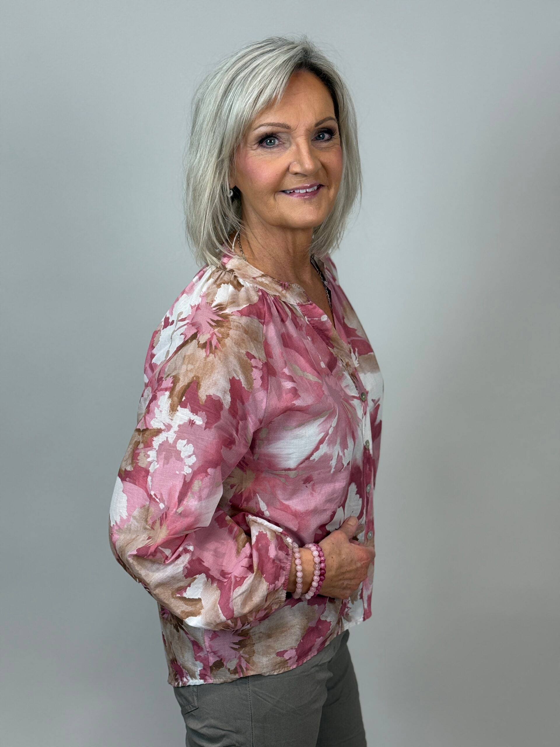 Gry är en snygg och lättburen blus från Mix by Heart med ett abstrakt blommönster som ger ett modernt och mjukt uttryck. Den v-ringade, helknäppta modellen gör blusen enkel att bära både öppen och stängd, medan resåren i ärmsluten och den diskreta rynken vid axeln tillför en feminin form. En perfekt blus för dig som vill ha något luftigt, stilrent och lätt att matcha till både jeans och kjol. Finns i färgerna Jeansblå och rosa