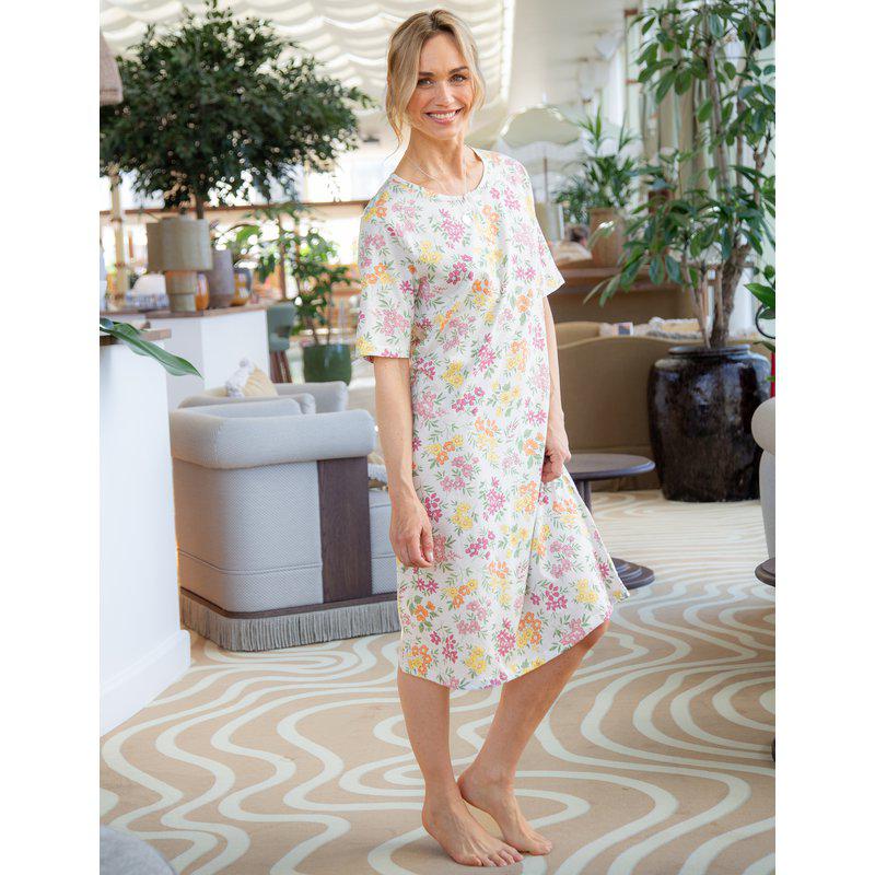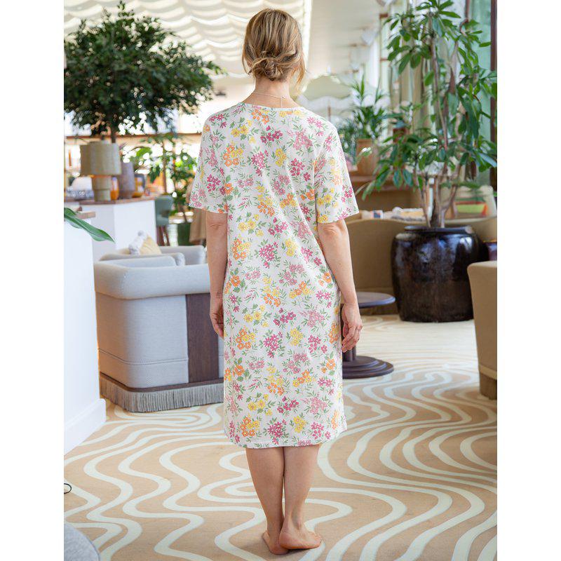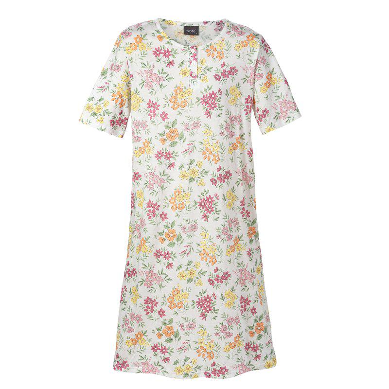 Kortärmat nattlinne i mjuk och skön bomullstrikå med blommigt mönster. Rundad halsringning med knappslå framtill. Längd: 110 cm i stl M Collection: Blooming